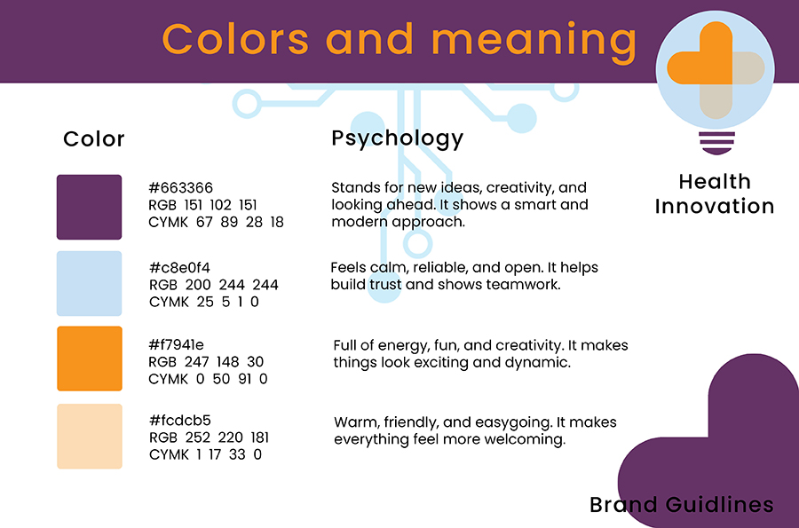 One of the most challenging aspects of this project was designing a logo that was both visually appealing and aligned with the branding guidelines of Fontys and the specific identity of the Health Innovation minor. My initial concept featured several symbols: a light bulb for innovation, a cross for healthcare, and a heart symbolizing passion and life. I also included a dot-and-line motif to represent technology and progress.