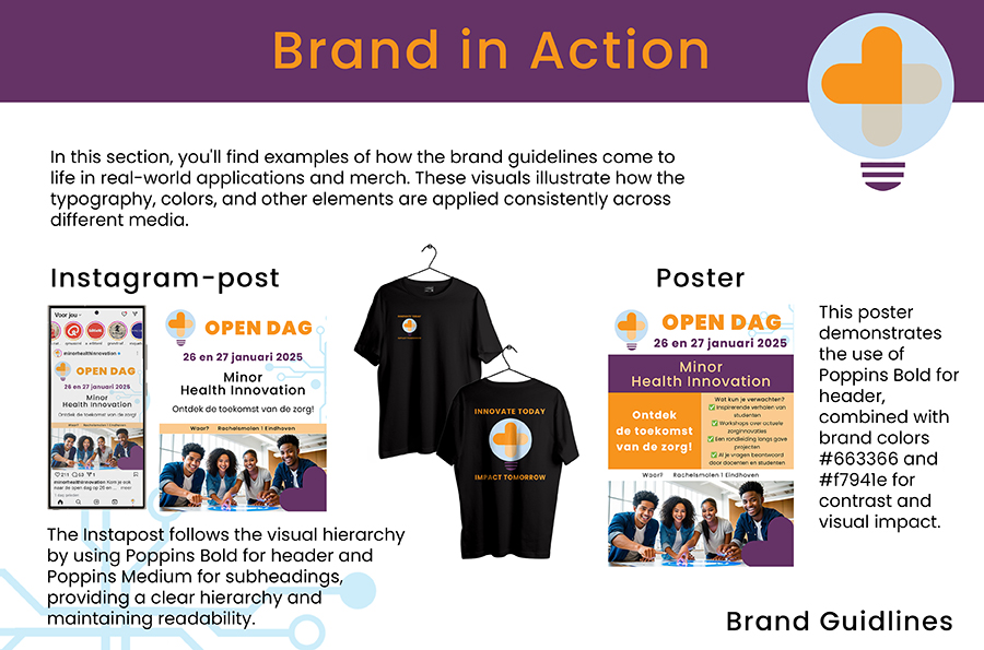 The project began with an analysis of the provided PowerPoint. After that I started with a Exploratory Research. These resources offered insight into the minor’s core values and challenges, such as limited visibility and competition with other programs. They also highlighted Fontys’ overarching house style, which emphasizes consistent typography, colors, and messaging while allowing flexibility for individual programs. To develop the brand identity, I conducted research on color psychology and selected a palette that reflected the minor’s core values. Purple was chosen as the primary color to maintain consistency with Fontys’ identity, while orange was added to evoke energy and innovation. I also selected Poppins as the primary typeface for its modern and approachable design, which complemented the innovative character of the minor. The logo design process involved several iterations. My initial concept was refined to ensure the design was clear and adaptable across various media. Once the logo was finalized, I created the style guide and brand guide, detailing the use of typography, colors, and other elements to maintain consistency. Next, I applied the branding to a poster and an Instagram post, focusing on visual appeal and clarity. The poster highlighted key event details (Open Day) while incorporating dynamic layouts and imagery that reflected the minor’s values. The Instagram post complemented the poster, maintaining the same visual style to ensure consistency across platforms. During the process, I revised the brand guide based on practical insights. For example, I refined the typography section to ensure clear guidelines for using different font weights and spacing.